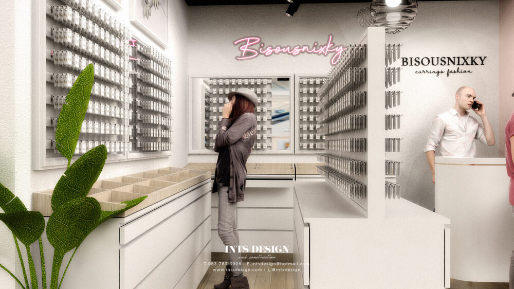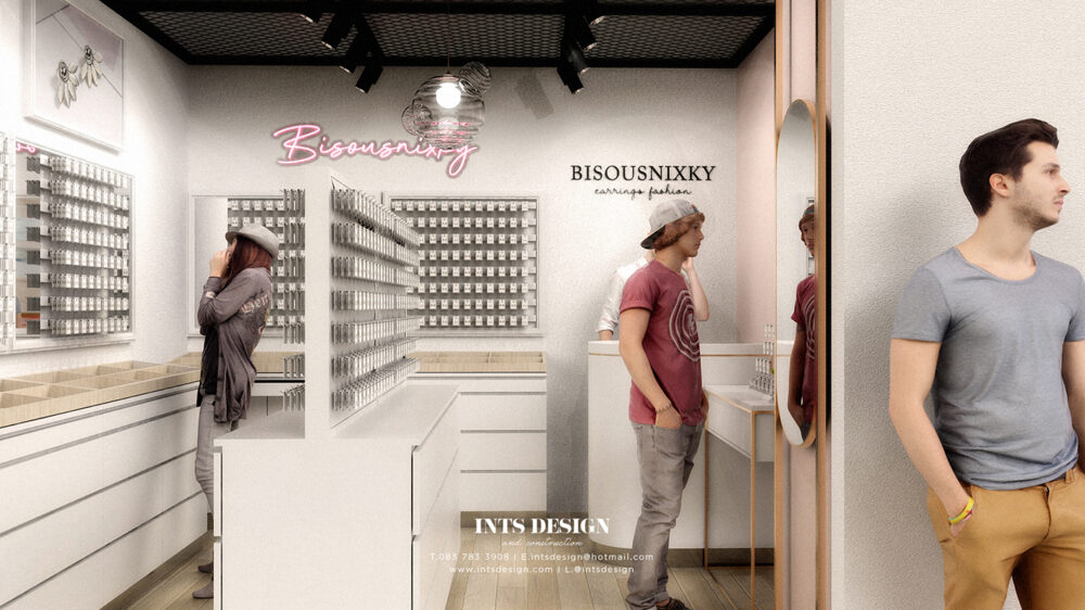 Project : BisousnixkyLocation : Terminal Pattayaร้านเครื่องประดับที่มีพื้นที่ขนาดเล็ก ความต้องการหลักคือการวางสินค้าให้ได้เยอะที่สุดพร้อมพื้นที่สำหรับสต๊อคสินค้า โทนสีหลักสีขาว-ชมพูต้องการเฟอร์นิเจอร์เป็นตัวลอยทั้งหมดเพื่อความสะดวกในการย้ายร้าน