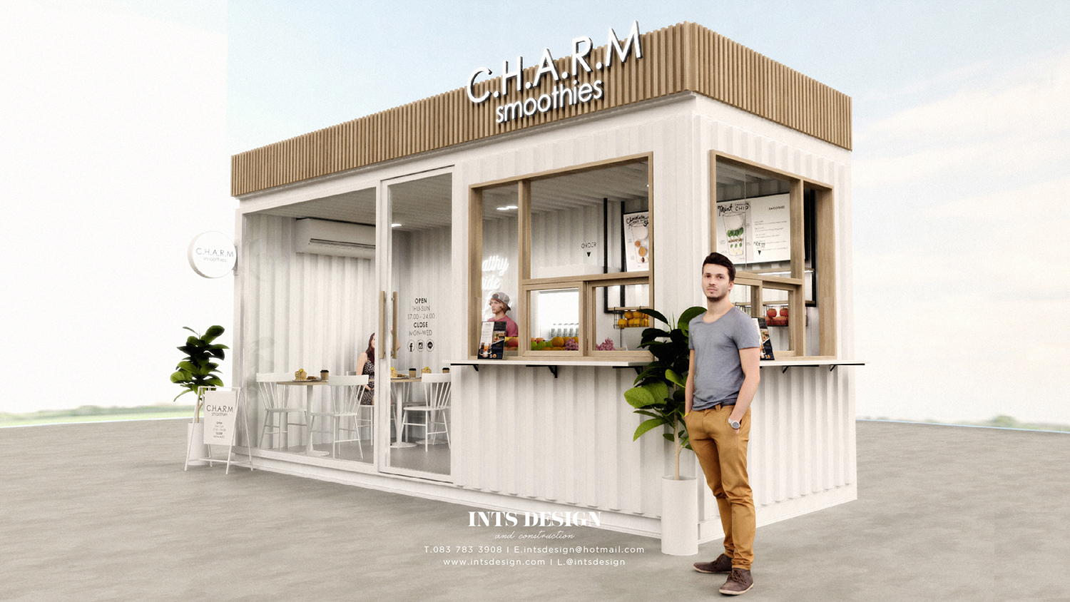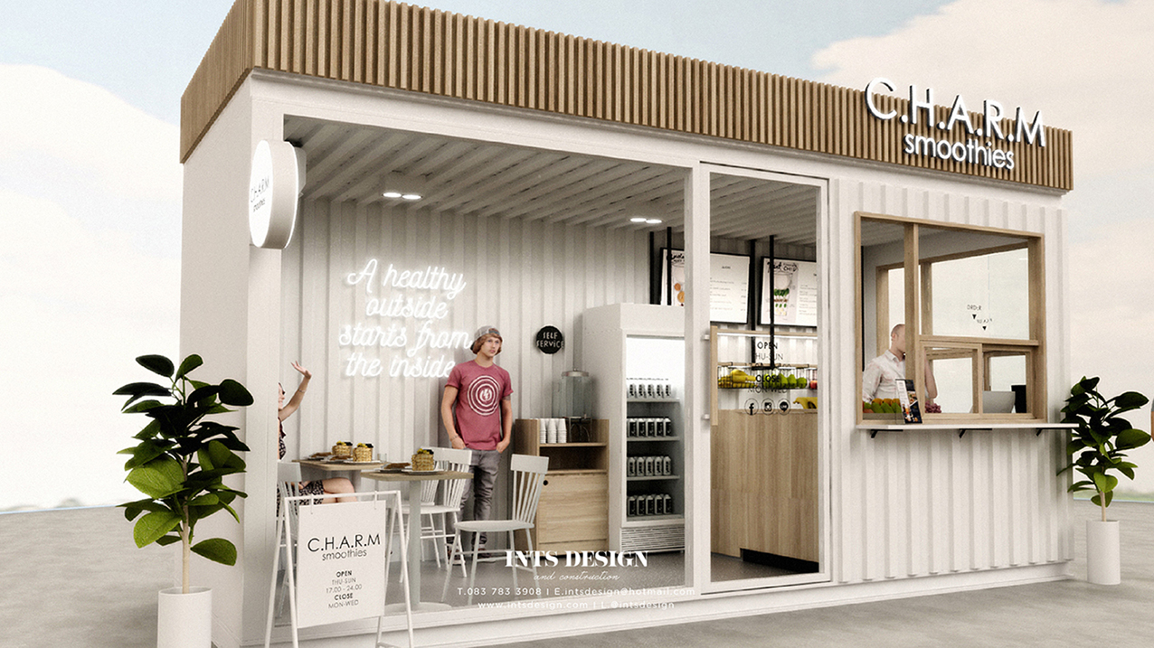 ร้านเครื่องดื่มสมูทตี้ เพื่อสุขภาพ โดยโจทย์ที่ได้รับคือต้องการตกแต่งในตู้คอนเทนเนอร์เดิมที่มีอยู่แล้ว